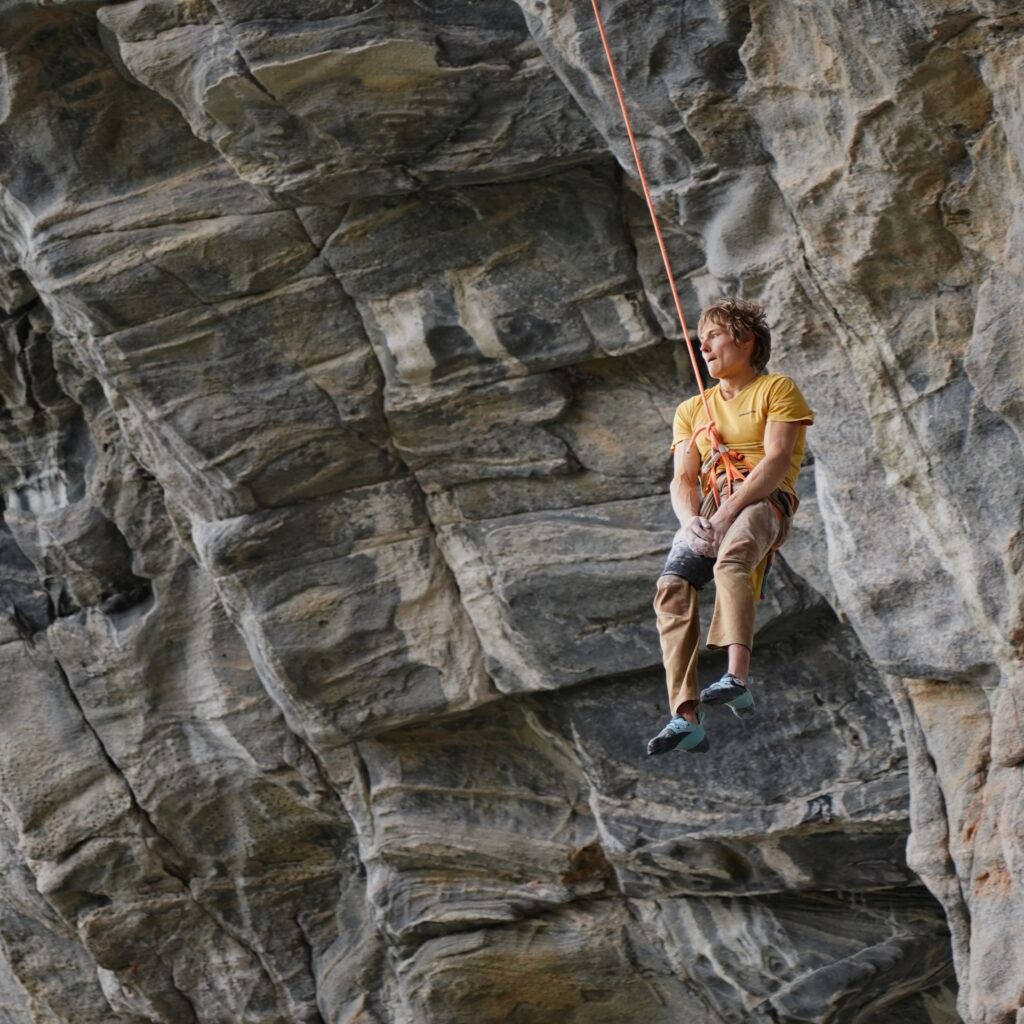 Alex’s traditional climbing style comes from his home crag in the Frankenjura, Germany, where the powerful limestone routes tend to be around twenty moves and take about five minutes to complete. Comparatively, the routes in the Flatanger take around 30 minutes to climb. The kneebars, which can make the climbing choppy, can also make them easier.
