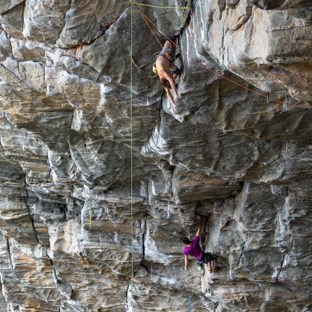 In 2015, only one or two ropes hung from the cave but in the past few years, climbers added more. The hanging ropes allow climbers to jumar up and access different parts of the wall. Alex ascended up to the last four bolts of Move and worked the difficult last moves. This allowed him to gain confidence so that he was able to climb to the ending well and then execute. When he finally stuck the end sequence, he was able to ride the momentum and send The Illusionist (9a) as well.