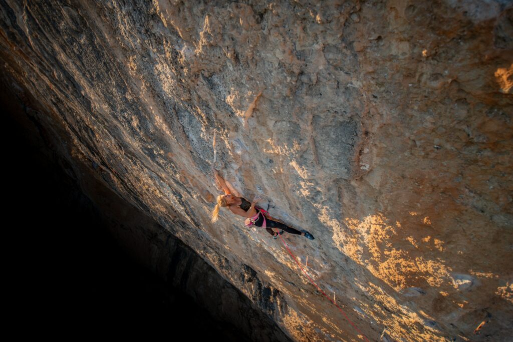 Svana Bjarnason on Fish Eye (8c/5.14b), Oliana, Spain. Photo: Will Barcelo.
