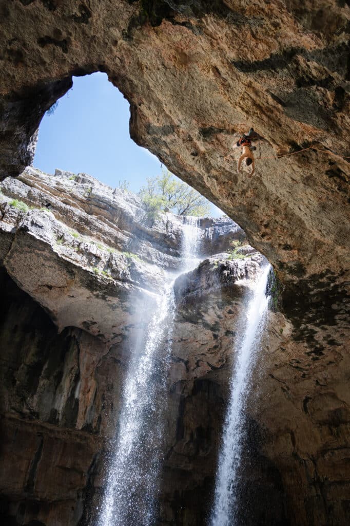 The steep, 35-meter route sits within the gorge, next to a roaring waterfall and above the intimidating sinkhole. When the wind blows in the wrong direction, the climb gets doused. Just accessing it can be a challenge. Fortunately, Jad El Khoury—a local climber and route developer, who belay David Lama during his first ascent—took Victor under his wing to help.