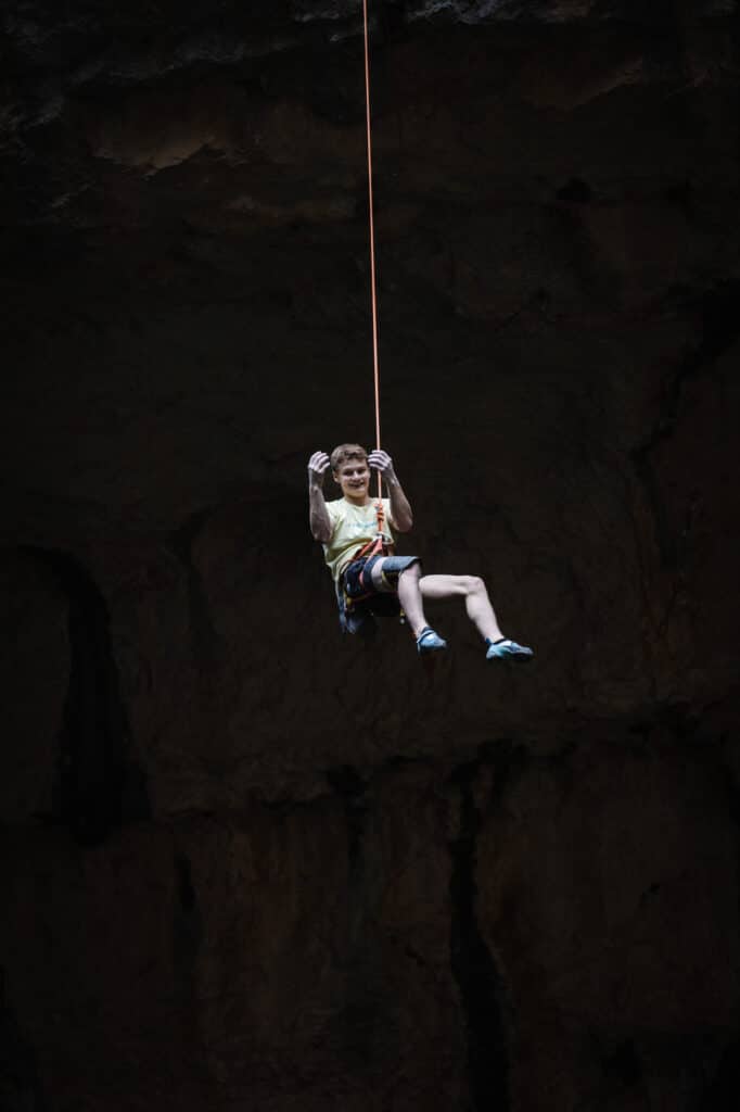 Honestly, the first time I saw the huge sinkhole I was scared—imagine climbing above a 100-meter hole, next to a waterfall, with a hazardous approach. Luckily, Jad secured the approach and I could try the route.